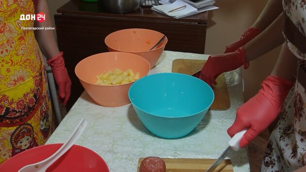 Ростовская область, 23 июля 2024. Телеканал «ДОН 24».«На солянку у нас нарезаются колбасные изделия, огурцы, каперсы и добавляем оливки». После чего весь набор в сыром виде закладывают в специальный пакет. Он заменяет консервную банку и выдерживает любые испытания. Главное – строго соблюдать граммовку. Это знает каждый член семьи Кунах. Леонид Кунах, волонтер: «Здесь в данный момент это гречка, если есть возможность закипятить – высыпали в котелок, налили кипятка, размешали, и вот тебе суп гречневый. Нет? Значит, прямо так в окопе поел». Завершающий этап – консервирование в автоклаве. После чего партию отвозят на передовую. Такие обеды для бойцов специальной военной операции волонтеры из Коврино готовят уже не первый месяц. Ирина Васильевна – учитель начальных классов, а Леонид Петрович руководит Ковринским сельским поселением. Помогают родителям дочь Виолетта и сын Станислав. Виолетта Кунах, волонтер: «Папа всегда всем помогает, и хуторским всем. Кто ни позвонит – всегда бежит, и пожары, и потопы у кого. Поэтому я не удивилась, что папа помогает. Мальчики там стараются за нас, чтобы мы спали спокойно, а мы будем стараться здесь, чтобы они были хотя бы сыты». Готовит семейство с любовью, поэтому и блюда получаются по-домашнему вкусные.