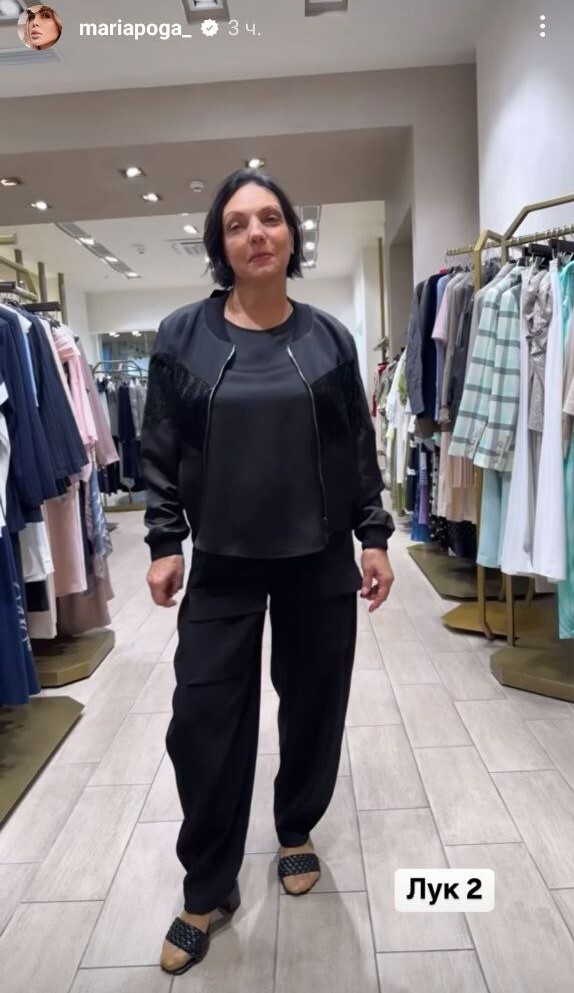 Всего мать Погребняк примерила три образа. Комментируя второй, Мария произнесла: «Какая современная бабуля. Штаны с кармашками, бомбер, так модно, еще аксессуар сейчас тебе».