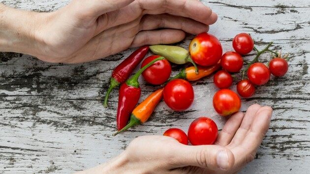 Вам понадобятся 6 кг помидоров, 1,5 кг перца, столовая ложка соли, стакан сахара, стакан растительного масла, уксус 9% — 5,5 столовой ложки.