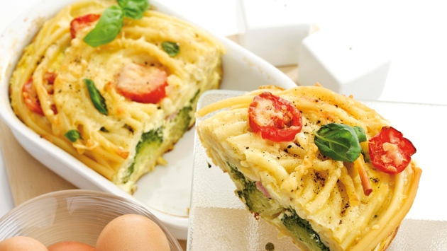 Выложите на дно курицу, добавьте заливку, сверху выложите три слоя: брокколи — помидоры — остатки сыра.
