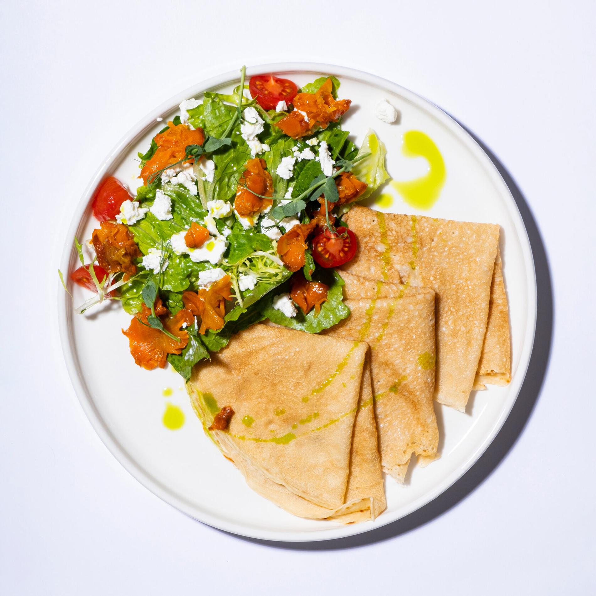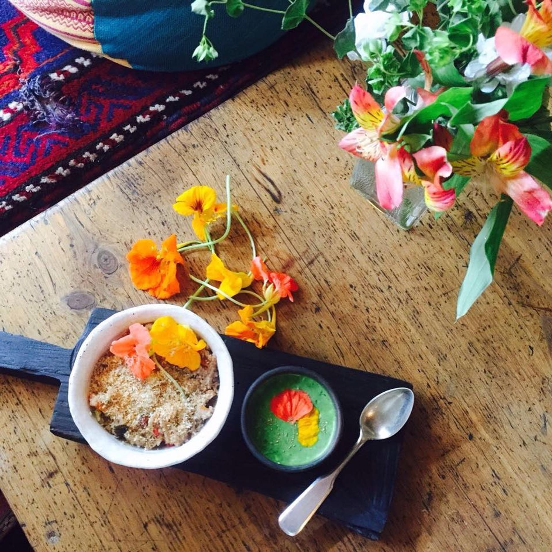 Для тех, кто любит начинать день с мук выбора по поводу того, что же заказать на завтрак. Рисовая каша на миндальном молоке, например, идет с грушей и соленой карамелью или с пюре из манго. Блинчики могут быть с веганским лососем или «курицей» из сейтана. Может быть, тофу-омлет или нутовые оладьи? На обед и ужин зато более классическое меню.