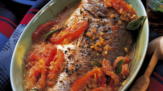 Сделайте с каждой стороны поперечные надрезы глубиной до хребта. Помидоры нарежьте дольками, перец очистите от семян и нарежьте кольцами.