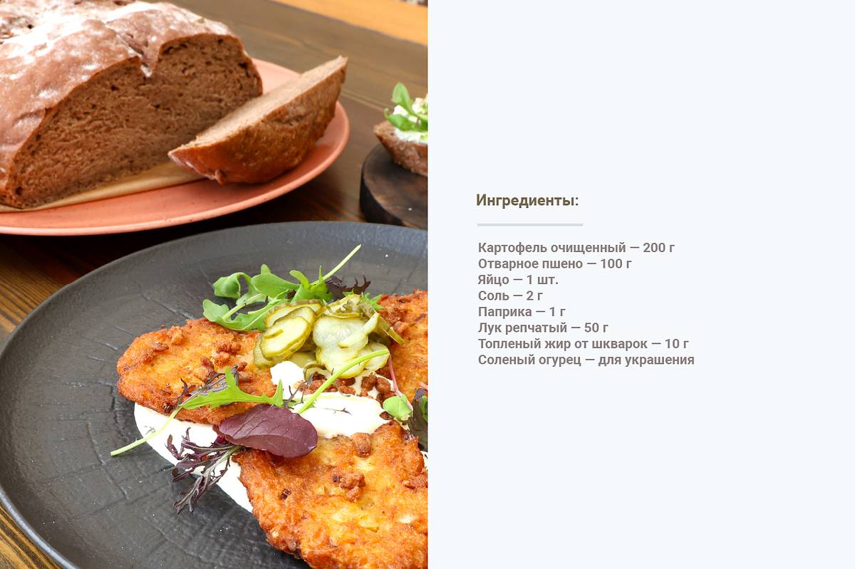 — Теперь приготовим простое, но тоже сытное и вкусное блюдо, вдохновленное любимой казаками кашей — кулеш. В традиционном виде это пшенная крупа и сало. Я решил соединить это блюдо с картофельными драниками и подавать со шкварками и сметаной необычного копчения. Этот метод я называю «варварским».