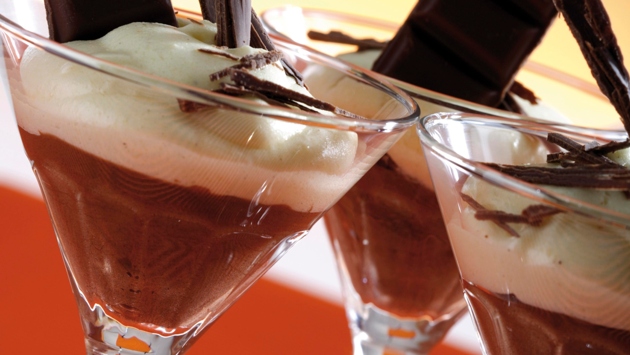 Шоколад растопите на водяной бане. Когда фрукты остынут, сделайте из них пюре с помощью блендера, а далее влейте шоколад. Взбивайте смесь еще несколько минут до воздушных пузырьков. Разлейте массу в основу для десерта и заморозьте в холодильнике.