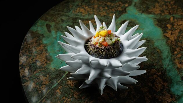 Из мини-форматов – пан-бриошь с щучьей икрой и маслом из водорослей за 850 руб., такос с сибасом и авокадо, приправленный жгучим халапеньо за 950 руб., гребешок с лососем, манго и ботаргой из икры морского ежа за 900 руб., а также тартар из говядины с костным мозгом за 1350 руб. и хрустящая чиабатта с ростбифом и вялеными томатами за 850 руб.