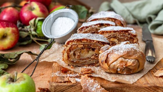 8. С помощью полотенца скатайте рулет и перенесите его на противень с пергаментом для запекания. Смажьте растопленным сливочным маслом сверху и сделайте три-четыре прокола по всей длине штруделя. Выпекайте 15–20 минут при температуре 200°С до золотистой корочки.