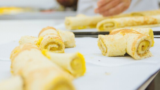 200 г муки смешайте с разрыхлителем и добавьте в массу. Разделите тесто на две части и раскатайте их в полоски.