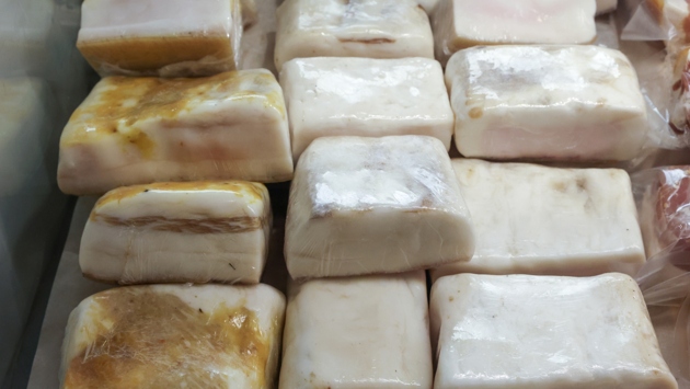 - Выберите свежее сало с плотной кожей, желательно с толщиной 2–4 см. Порежьте его кусочками размером 10–12 см для удобства засолки. Промойте и обсушите салфетками или бумажным полотенцем.
