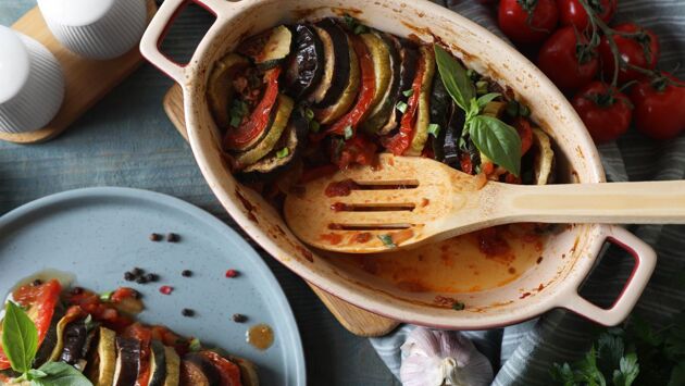 Рататуй — это овощное рагу из провинциальной Франции, главными ингредиентами которого выступают сезонные овощи: баклажаны, патиссоны, красный и белый лук, цукини, помидоры и перец. Идеальная гамма цветов и вкусов, которая подчёркивается прованскими травами, специями и, конечно, томатным соусом.