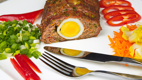 - Раскатайте фарш в пласт на пергаменте. Выложите вареные яйца вдоль одного края.