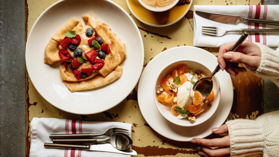 В меню завтраков вошли: бриошь с глазуньей, моцареллой, индейкой и трюфельным соусом; пшеничные блинчики на молоке, которые подают с голубикой, малиной, клубникой и кремом из вареной сгущенки; творог с мандарином и грецким орехом - сочетание, которое могло случиться только русской зимой и безвозвратно влюбить в себя каждого; пшенная каша с кусочками томленой айвы и орехом пекан.