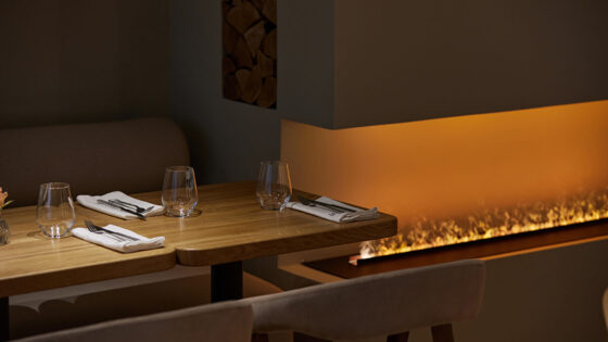 В ресторане три пространства и каждое со своими бонусами, первое — с камином и окнами на московский вайб, второе с барной стойкой, камерными столиками и диванами, а третье самое большое — зал с видом на открытую кухню для больших компаний.