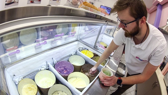 Москвичи среди россиян - самые большие сладкоежки. Если житель России в среднем съедает около трех килограммов мороженого, то москвич почти вдвое больше - около 5 килограммов. Самые любимые сорта у горожан - ванильный, шоколадный в вафельных стаканчиках и эскимо. Но этим летом многие смогут попробовать и необычные вкусы, которые придумали производители мороженого одной из крупнейших столичных фабрик.