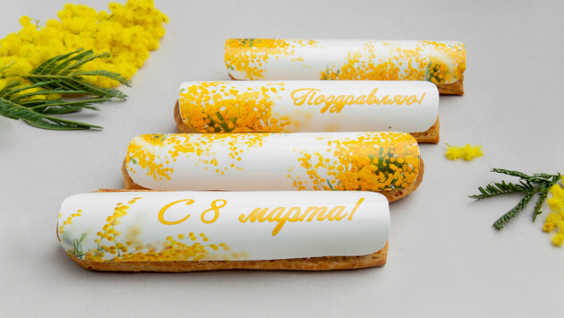 В кондитерской «Любовь и сладости» Регины Бурд и Сергея Жукова в Международный женский день предлагают дарить и то, и другое: коробка с живыми цветами здесь – не просто букет, а стильный торт. Наборы эклеров (1200 рублей\4 шт.), покрытых белым бельгийским шоколадом с фотопечатью, станут прекрасной альтернативой поздравительной открытке.