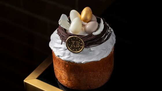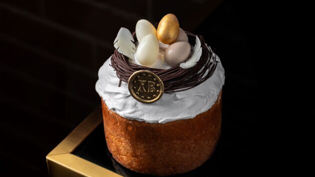 Пекари и кондитеры этого ресторанного комплекса так же приготовили несколько видов куличей. Среди них есть кулич с заварным кремом и малиновым конфитюром. Сладкий декор это кулича выполнен в виде гнезда с разноцветными яйцами. Есть в этой коллекции и кулич без особого декора, но там описания достойна рецептура: кулич с фундучным макаронажем и соленой карамелью.