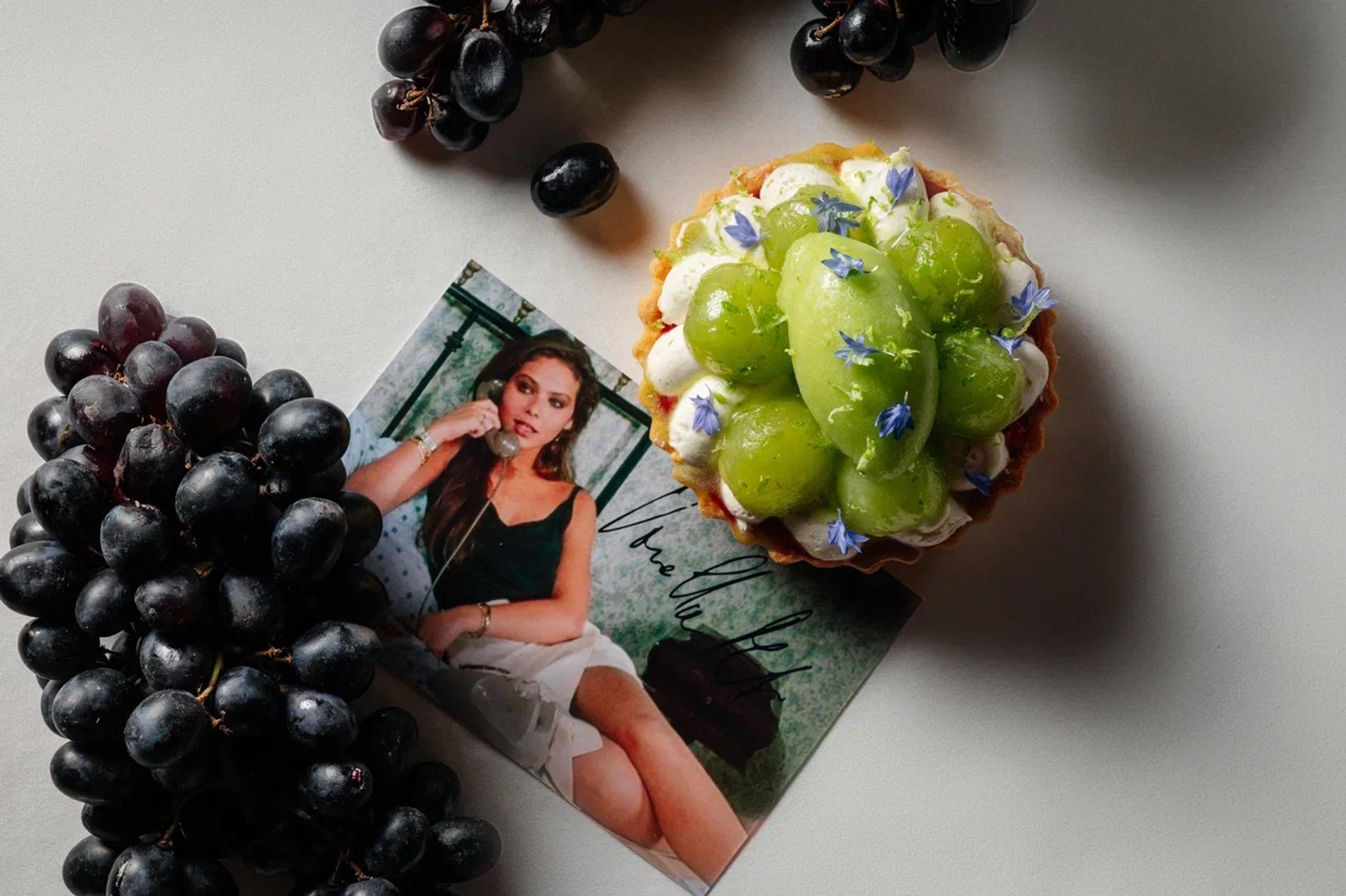 Тарт из песочного теста с миндальным кремом, клубничным конфитюром и ванильным взбитым ганашем — как сладкая ода, посвящённая Орнелле Мути. Десерт подаётся в деревянной бочке, заполненной виноградом, и сопровождается яблочно-виноградным сорбетом и васильками, цвет которых напоминает оттенок глаз актрисы.