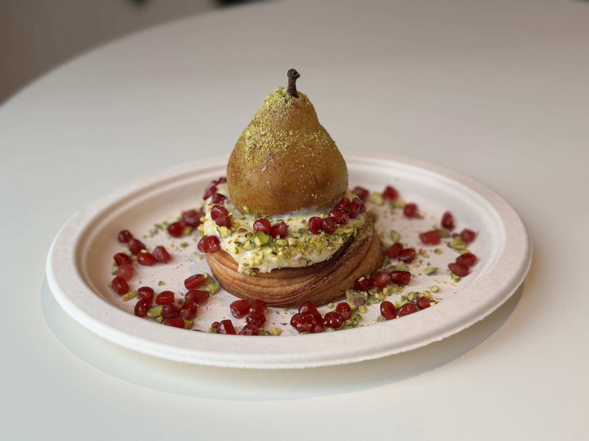 Висит груша — нельзя скушать. Но не в случае, когда на тарелке десерт из слоёного теста с грушей в соусе «марсала». Любопытно, что этот соус чаще используется для приготовления блюд из мяса, но рядом с грушей он приобретает ещё более яркий вкусовой оттенок. Крем «патисьер», фисташки и зёрна граната — в качестве завершающих штрихов.