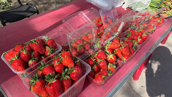 «Клубника сорта «Клери», она крупного размера. Вкусная, сладкая, мясистая», – уверяет продавец, но убедиться в правдивости его слов не представляется возможным.