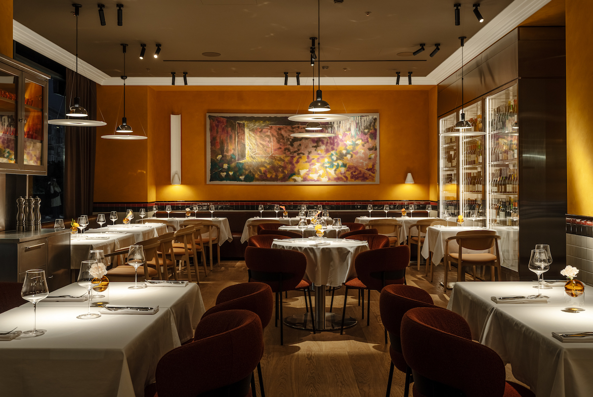 Интерьер работы NB Studio Натальи Белоноговой основан на эстетике итальянского модернизма 1960-х. Смелая палитра охристо-терракотовых стен, уходящих в сланцево-серый потолок, подчеркнута графическим ритмом керамической плитки. Абстрактная работа художника Петра Кирюши «Портал закрывается», с одной стороны, служит ярким художественным акцентом, с другой, подчеркивает стремление к современности, которым пронизана вся остерия.