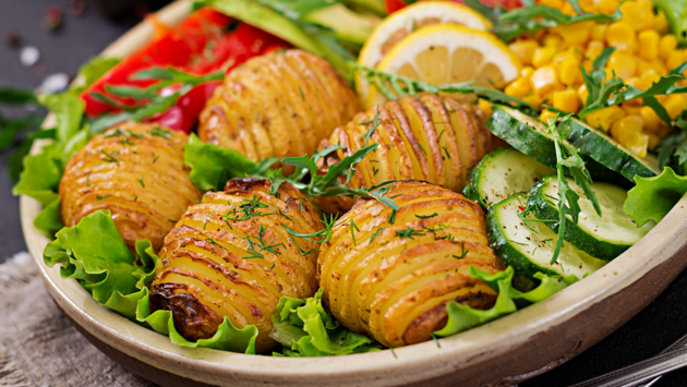 Один из самых популярных салатов этой осени – сочетание запеченного картофеля и свежих овощей. Основу блюда составляет теплый картофель: отваренные клубни разминаются, выкладываются на противень, приправляются солью, перцем, паприкой, сбрызгиваются маслом и запекаются при 200 °C около 25 минут до румяной корочки.