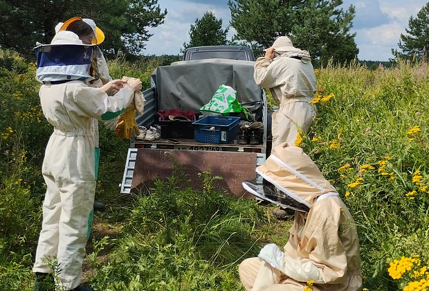 На грунтовке среди полей гостей встречают Вероника Далецкая и Дмитрий Шарапенко — супруги и хозяева семейной пасеки «Апухлицы». Всех наряжают в защитные костюмы: широкая панама с сеткой, комбинезон на липучках, перчатки, резиновые сапоги… Размеры одежды и обуви гости прислали заранее. Во время недолгой прогулки от грунтовки до пасеки Вероника рассказывает о себе и своем хозяйстве.