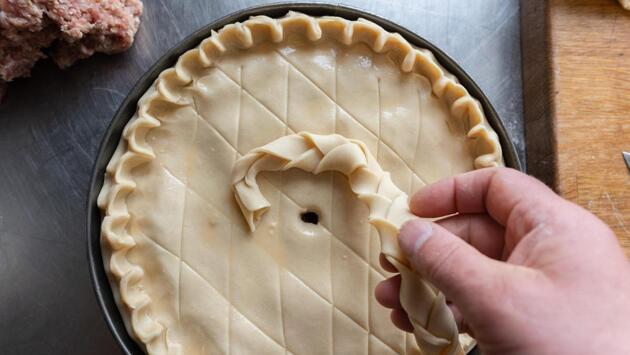 С тестом вообще ничего не выдумываем и просто берем готовое, примерно 250 граммов. Смазываем форму маслом, раскатываем тесто, а в середину отправляем начинку. Сверху накрываем фольгой и запекаем сначала час на 200 градусах, потом снимаем фольгу и продолжаем при этой же температуре еще полчасика.