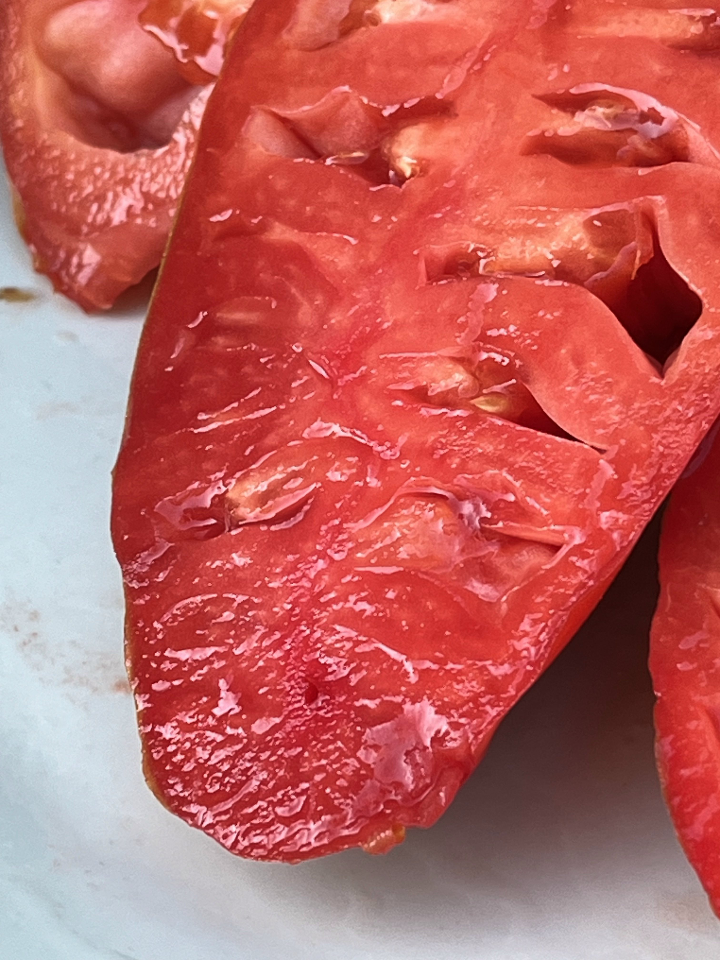 Этот томат мне очень понравился. При том, что кожица у него тонкая, но она какая-то эластичная. Поэтому плоды в полной спелости могут храниться 2-3 недели, в отличие от других нежных салатных сортов. Плоды очень сочные и плотные.