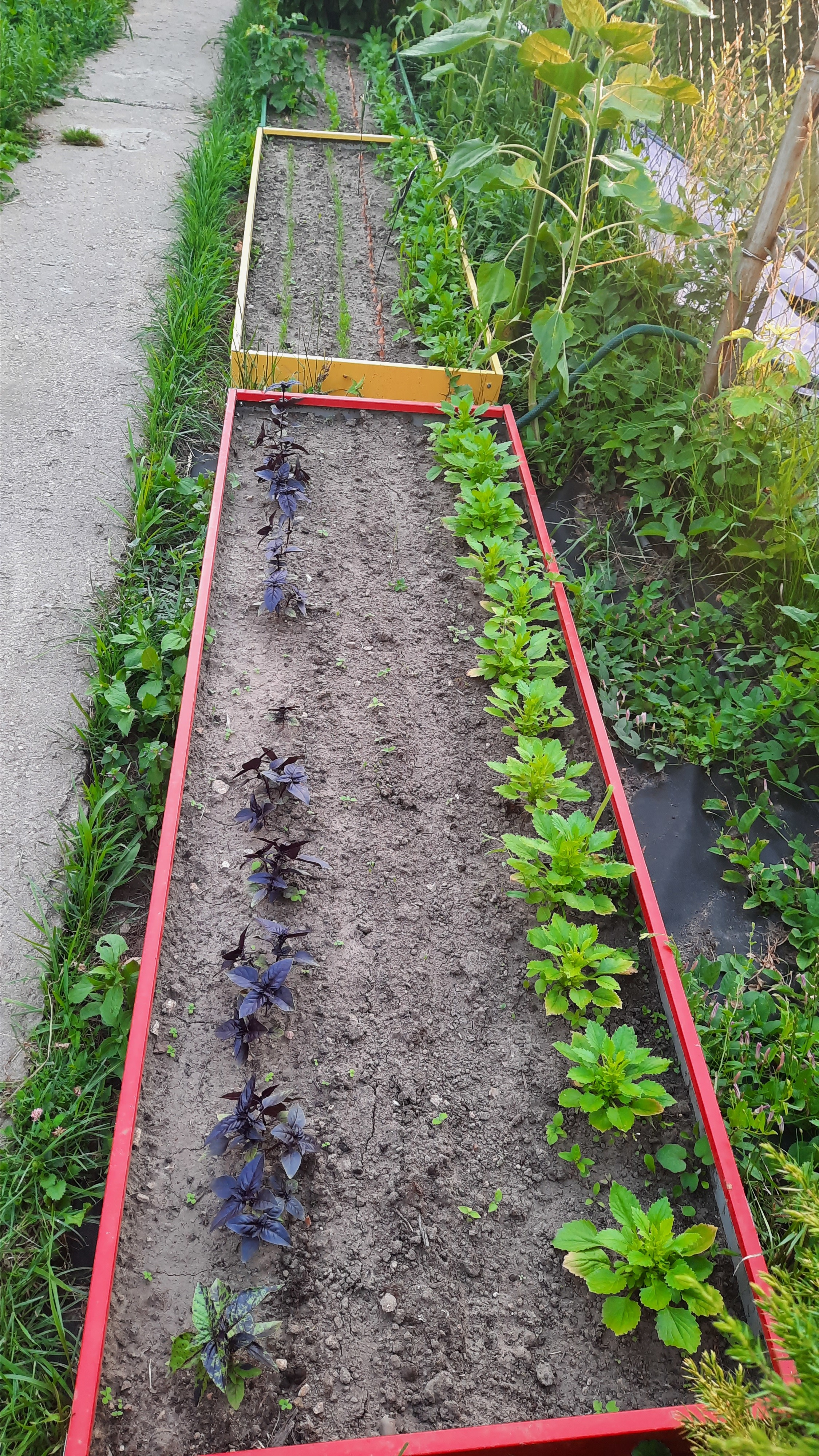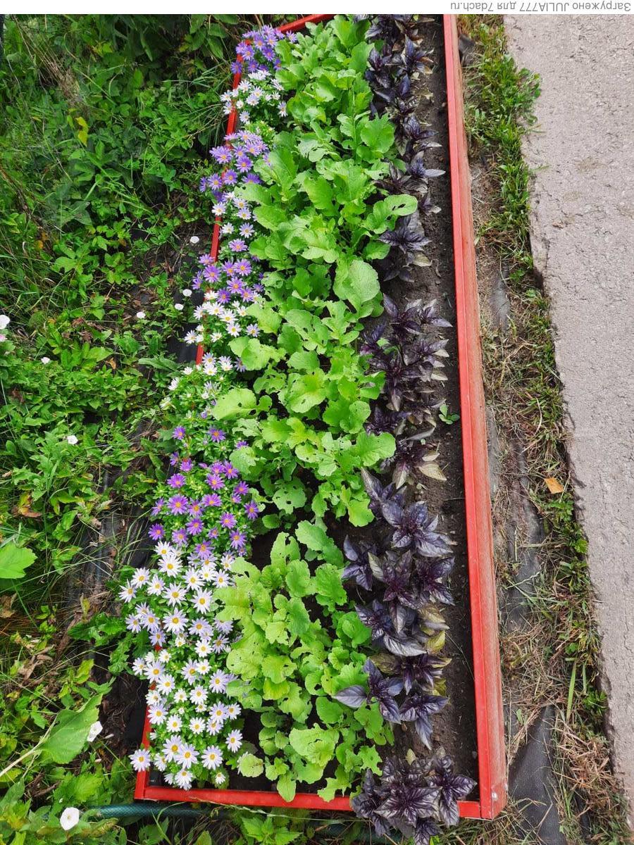 Очень довольна, что совместила приятное с полезным. Один рядочек на каждой грядке заняла рассада низкорослых мелких астрочек, а два — вкусная пряная зелень (шпинат, редиска, укроп, салат, лук, листовая капуста, базилик, кудрявая петрушка...)