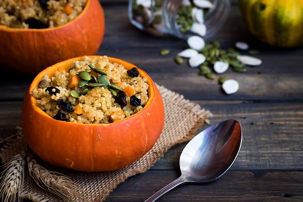 Выберите красивую круглую тыкву без повреждений и тщательно вымойте ее жесткой щеткой, но строго без мыльных средств. Срежьте верхнюю часть тыквы на четверть высоты. Не выбрасывайте ее, это будет крышка импровизированной «формы» для запекания каши. Достаньте семена и волокнистую мякоть из тыквы ложкой — нужно, чтобы остались стенки толщиной 2-3 сантиметра. Залейте промытое пшено кипятком и оставьте на 10 минут. Это поможет убрать горчинку из крупы. По истечении времени слейте воду. Промойте изюм и залейте горячей водой на 15 минут, чтобы немного разбух и размяк. Смешайте в кастрюле молоко, сливки и воду, доведите до кипения на среднем огне. В кипящее молоко со сливками добавьте пшено, варите в течение 5-7 минут, постоянно помешивая. Снимите кашу с огня, добавьте сахар, соль, ванильный сахар, корицу и 50 граммов сливочного масла. Отожмите изюм и смешайте его с кашей так, чтобы он равномерно распределился в крупе. Наполните тыкву кашей примерно на три четверти от объема. Учитывайте, что крупа будет развариваться. Положите оставшееся сливочное масло поверх каши и закройте тыкву срезанной крышкой. Установите тыкву в глубокую форму для запекания и налейте на дно 1-2 сантиметра горячей воды. Поставьте форму в разогретую до 180 градусов духовку и запекайте 1,5-2 часа. Через час проверьте предварительную готовность: нож должен легко проходить сквозь стенку тыквы.