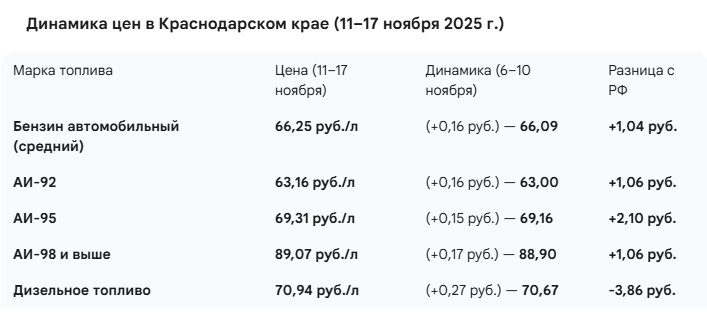 Ожидаемым исключением стало дизельное топливо. Оно в регионе стоит 70,94 рубля, что, напротив, на 3,86 рубля дешевле, чем в среднем по России (74,8 рубля). Это коррелирует с более ранними данными Росстата за сентябрь 2025 года: тогда АИ-92 стоил 61,16 рубля, АИ-95 — 67,5 рубля, АИ-98 приближался к 87 рублям, а дизель на Кубани был дешевле, чем в целом по России, и стоил 68,5 рубля за литр.