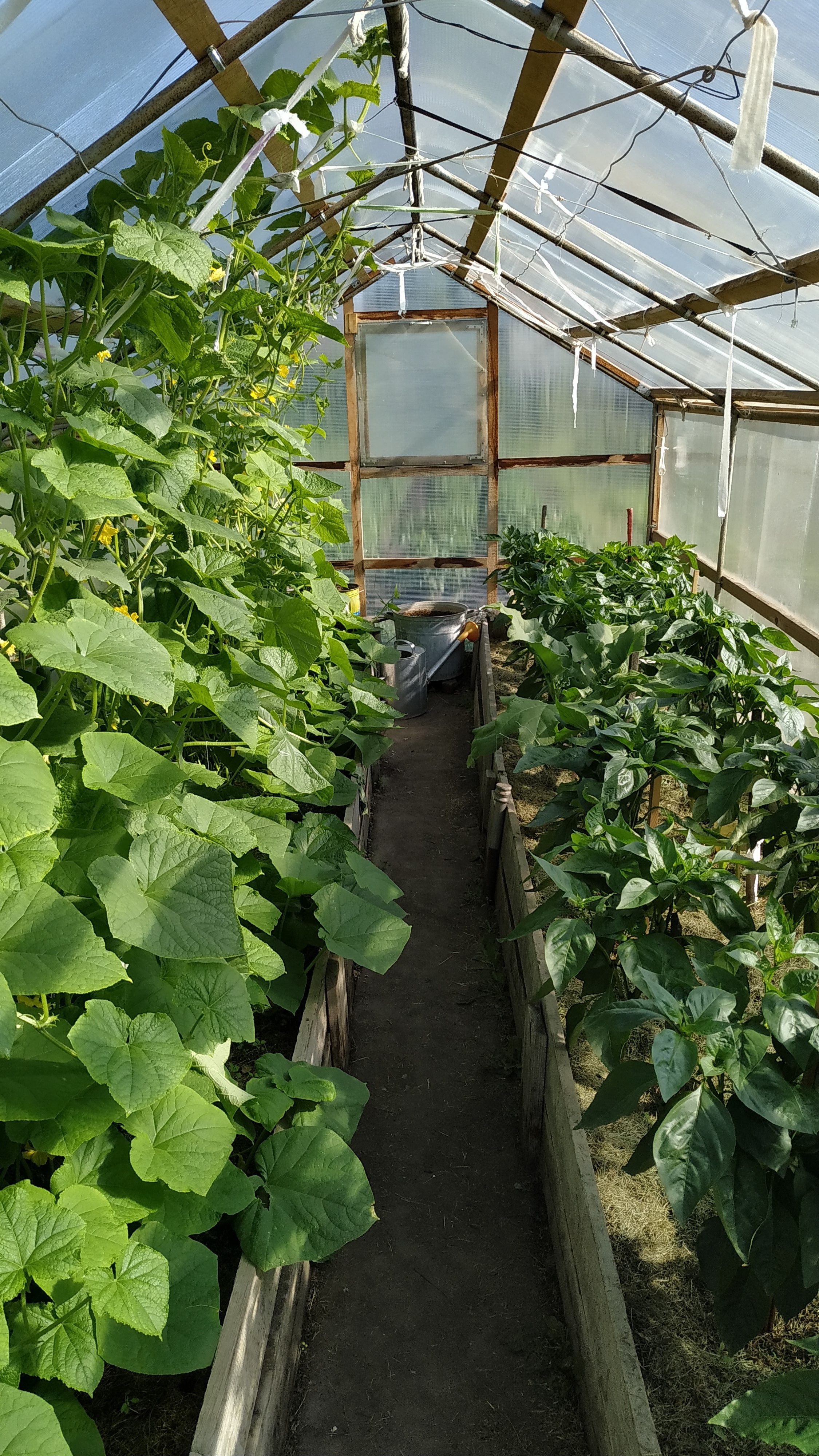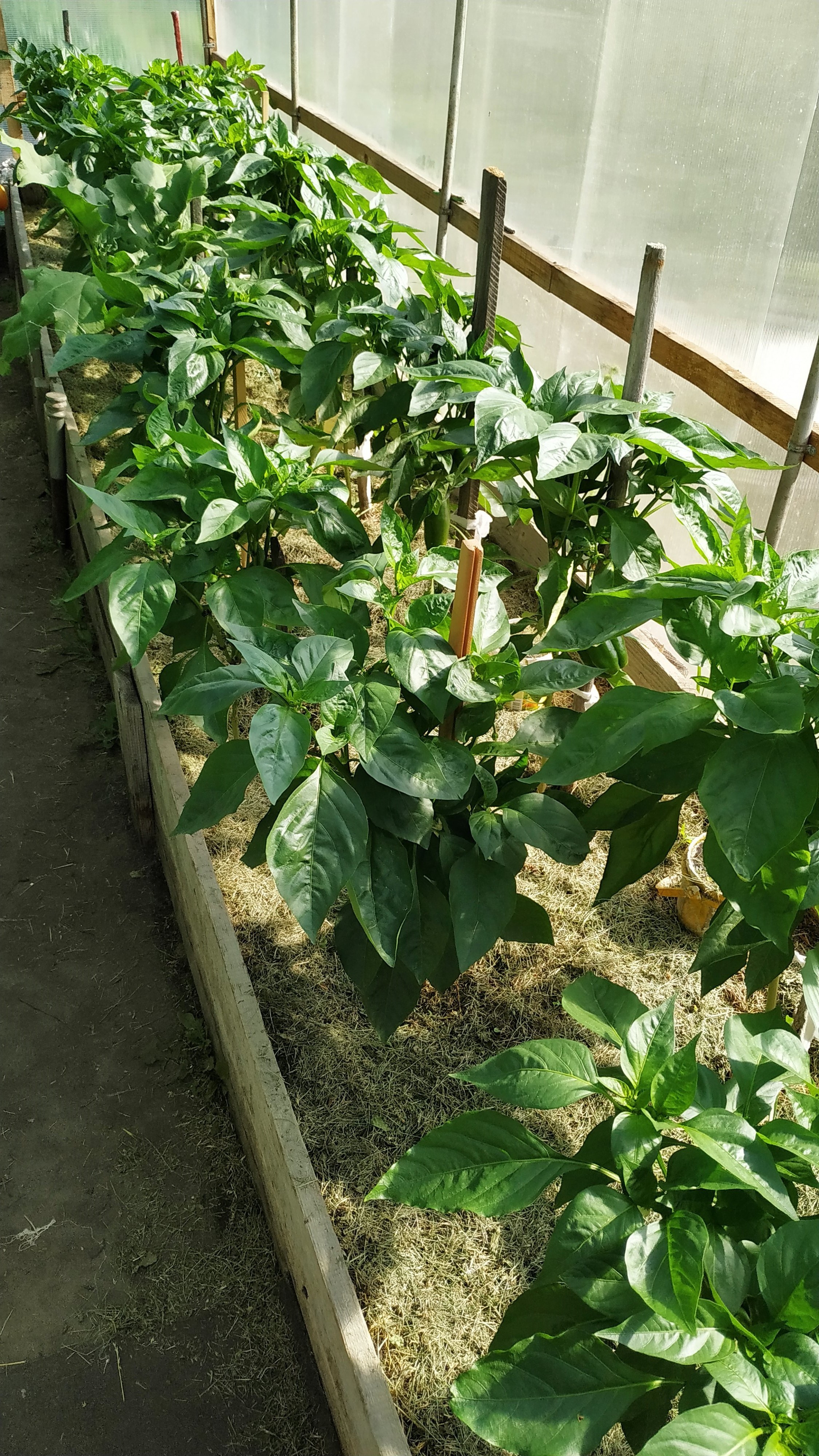 Как говорится, до всего человек должен дойти сам. Чтение статей, рассказы дачников-удачников не помогают, пока однажды не осознаешь, что перец любит тепло, влажность и правильное формирование. Сначала мы переделали теплицу для перцев и огурцов (они любят схожие условия выращивания). Убрали пленку и поставили поликарбонат. Грядки у меня в огуречнике всегда были высокие, теплые, на 2 доски. Раз в 2-3 года в октябре в середину каждой грядки закладываем опавшую листву с березы. За зиму черви и микроорганизмы перерабатывают основную массу в перегной, а что не перепрело, дает тепло маленьким корешкам по весне.