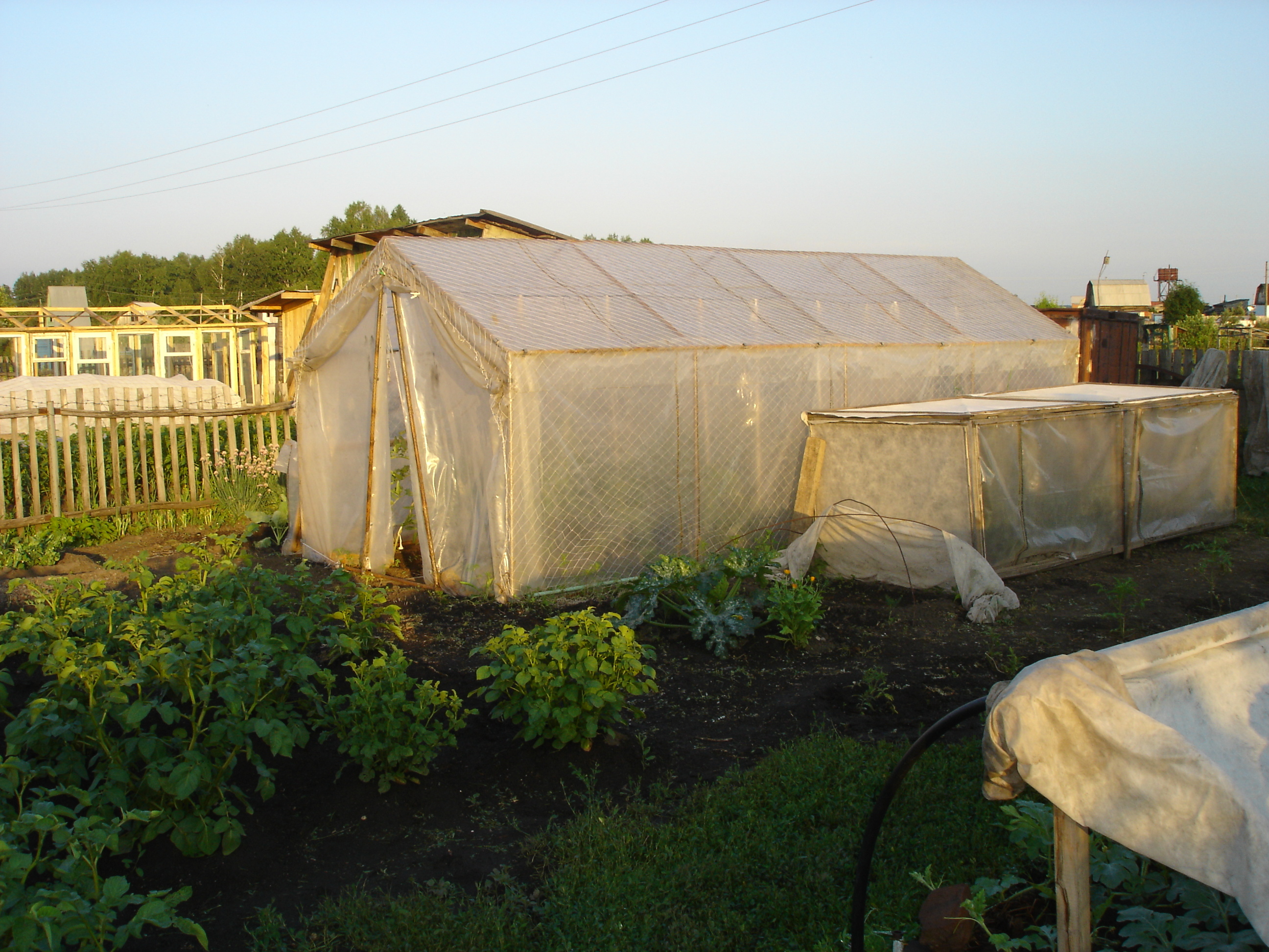 . Первая тепличка была собрана из тонких брусков 5х5, укрывного и пленки. Открывалась теплица и сверху, и сбоку. Сверху — проще поливать и проветривать, две дверки сбоку использовала для прополки и рыхления. Существенный минус: полоть приходилось стоя на коленях.