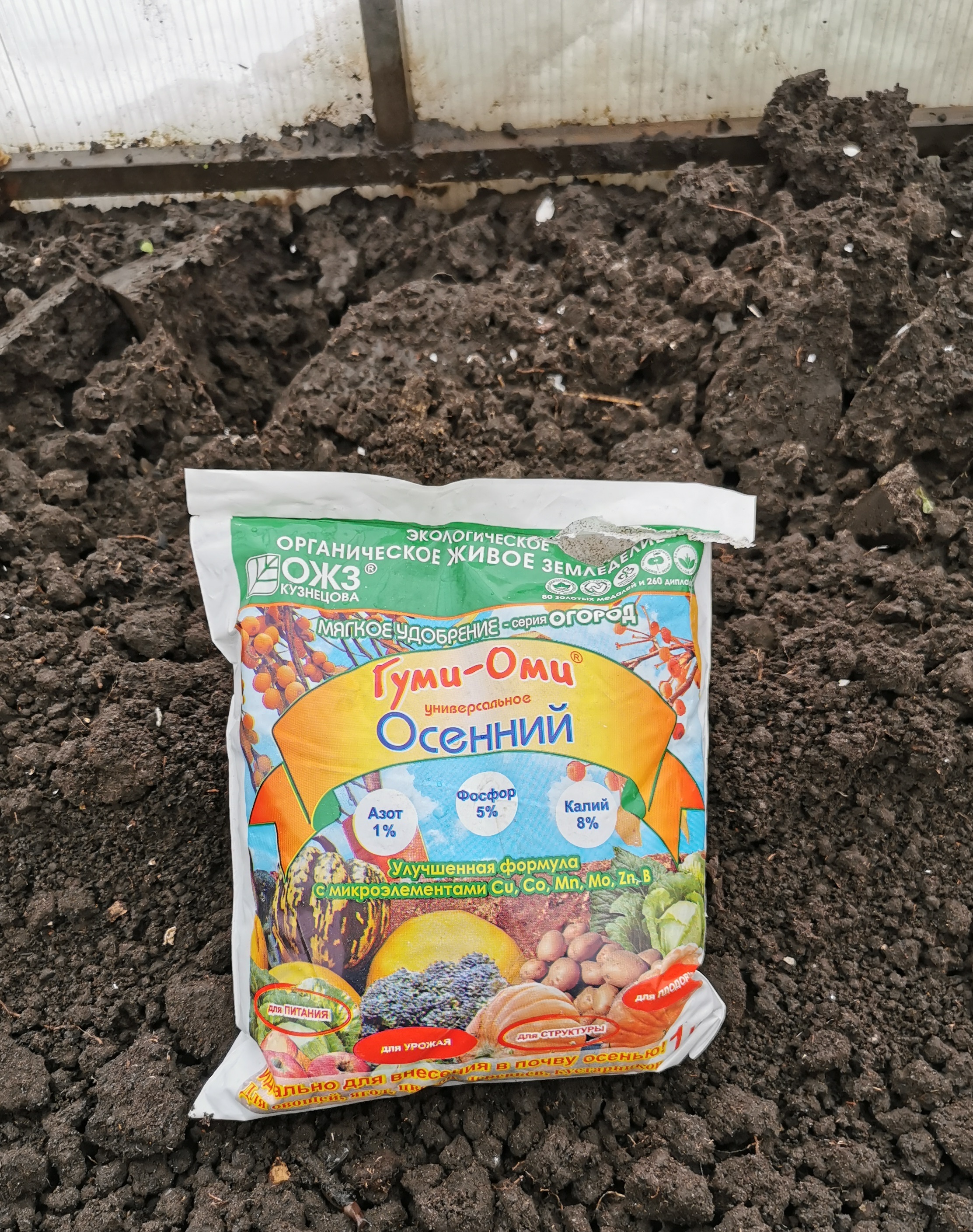 Добавлю к написанному только то, что этой осенью вместо доломитовой муки впервые использовали Мягкий раскислитель ОЖЗ «Известь–гуми» от «БашИнком». Это не просто раскислитель — это органоминеральное удобрение. В состав удобрения, кроме извести в мягкой форме, входят кальций, магний, бор, гуматы, фосфор и азот. Содержимое двухкилограммового пакета разбрасывали очень экономно, чтобы хватило на всю теплицу. Маловато, но ничего страшного, ведь раскислитель ОЖЗ можно вносить и весной. Вот такая приятная находка и открытие.
