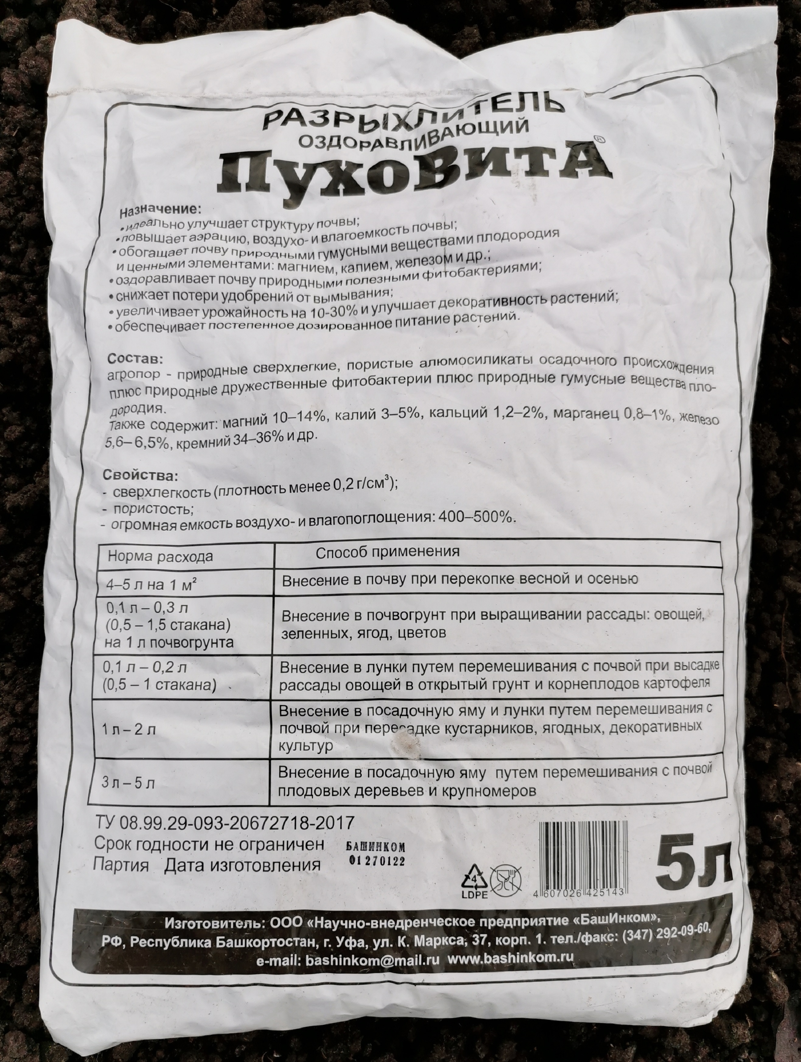 Для нас разрыхлитель «ПухоВита» – новинка. Производитель обещает, что благодаря сверхлегкости и пористости природного материала, который и составляет основу разрыхлителя, почва изменит свою структуру, станет рыхлой, обогатится гумусными элементами и очень нужными для растений магнием, калием и железом, марганцем и кремнием. К тому же полезные фитотбактерии помогут грунту обрести здоровье. Производитель проверенный, поэтому в эффективности новинки не сомневаемся.
