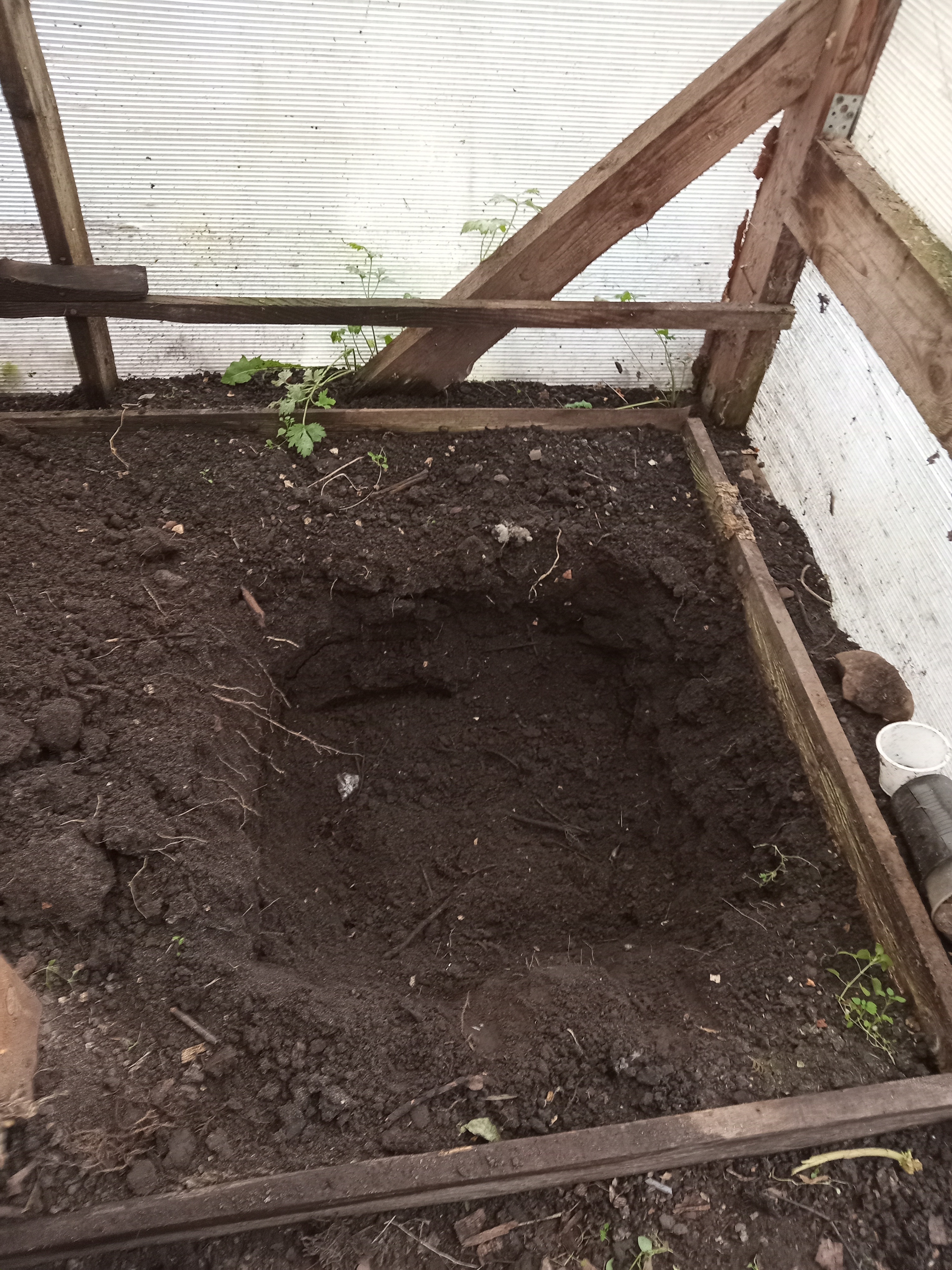Первую ямку, что для ранних огурцов, в конце апреля проливаю кипятком, добавляю немного золы и яичной скорлупы.