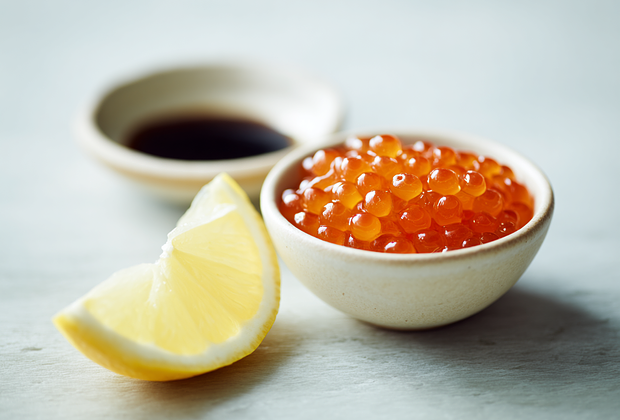икра форели — 300 граммов; густой соевый соус — 9 столовых ложек; сухое белое вино или саке — 6 столовых ложек; сахар — 1 чайная ложка; лимон — 1 штука.