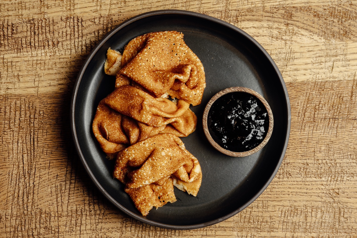 Блины выпекают из овсяной муки, овсяного молока, яиц, тростникового сахара и меда и дополняют домашним вареньем.