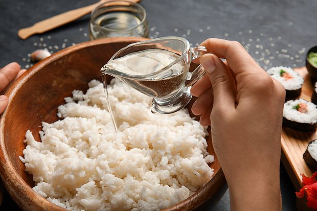Горячий рис переложите в широкую миску и добавьте заправку на основе рисового уксуса. Классический состав заправки: