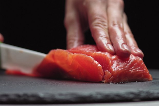 Перед нарезкой рыба должна быть охлажденной, но не замороженной повторно. Важно нарезать ее тонкими, длинными полосками толщиной около 0,5-1 сантиметра.