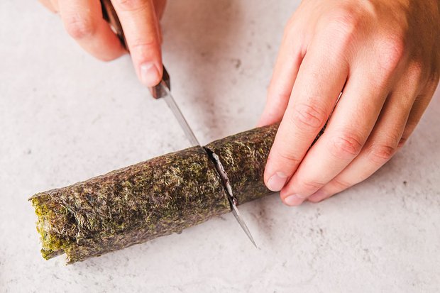 После формирования рулета смочите нож в холодной воде, чтобы он скользил по рису, а не рвал его, затем приступайте к нарезке. Ролл разрезают сначала пополам, затем каждую половину — еще на три-четыре части, в зависимости от желаемого размера.
