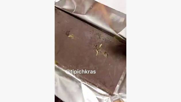 На кадрах россиянка показывает две плитки шоколада одного из брендов — по обеим ползают черви белого цвета. Автор видео показывает срок годности одной из плиток — согласно ему, продукт годен к употреблению до 2027 года.