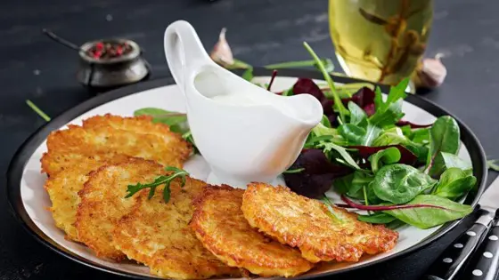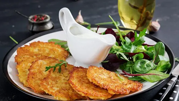 «Журунчики» рекомендуется подавать немедленно, пока картофельный слой остается хрустящим. Лучшим дополнением к блюду станет холодная густая сметана или соус на основе йогурта с укропом.
