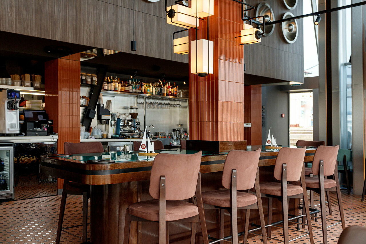 Пространство ресторана словно наполнено светом и воздухом: обстановку дополняют панорамные окна, морские элементы в интерьере и продуманные детали. Для гастрономичного вечера наедине с любимым человеком выбирайте гребешок с картофельным гратеном, соусом из трех видов икры и мандариновым понзу (1940 р.), ригатони с моллюсками в насыщенном соусе биск (1280 р.) или черную треску с цукини и муссом из северной креветки (1480 р.).