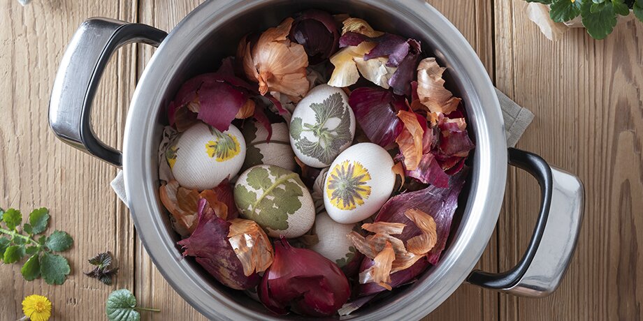 Можно поэкспериментировать и с длительностью окрашивания: первую партию извлечь раньше, а вторую подержать дольше. Если хочется узоров, то перед погружением в краску яйца можно обернуть в капустные листья, нитки или ткань. Тогда цвет ляжет мраморными разводами и каждое яйцо будет иметь уникальный узор.