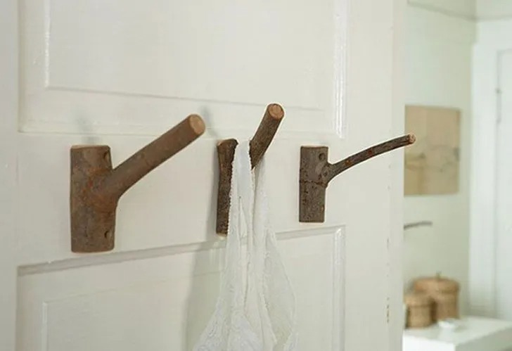 Бесподобно смотрятся в интерьере крючки-вешалки из сухих веток. Их можно прикрепить на двери или на стене в специальной раме.