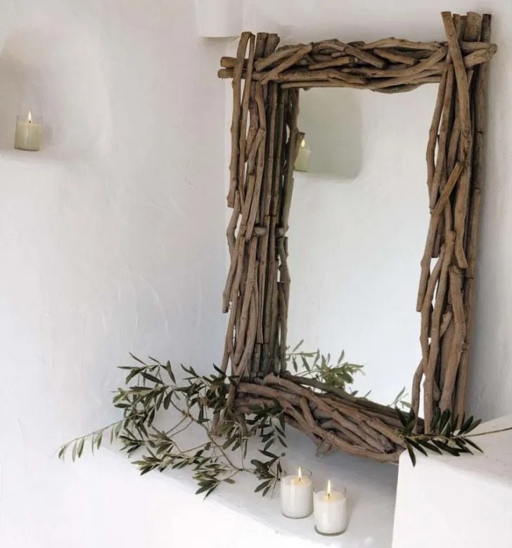 Небольшие тонкие веточки — прекрасный материал для декорирования зеркал. Такие предметы интерьера вносят в пространство особый колорит.