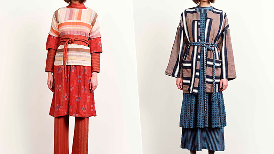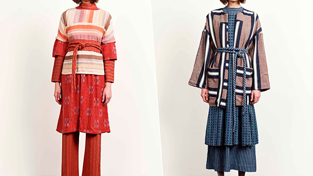 Главной чертой Ace & Jig, отличающей марку от конкурентов, всегда были принты, выполненные вручную в Индии. В осенне-зимней коллекции используются паттерны, традиционно свойственные мужскому костюму — тонкая полоска, “пастушья” клетка, шотландка. Надевая юбку поверх брюк или дополняя брючный костюм оборками, Ace & Jig призывает не отказываться от женственности, но и не преуменьшать свои силу и смелость. Стоимость топов — от 13 000 до 18 000 рублей, юбок и брюк — от 14 000 до 22 000 рублей, платьев — от 14 000 до 27 000 рублей.
