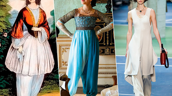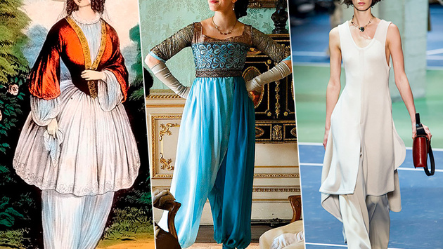 Я всегда искренне недоумевала, когда в документальных фильмах или статьях блумерсы позиционировали как первые женские брюки: мол, никогда ничего подобного не было и это изобретение - самое что ни на есть западное. Вещь эта, бесспорно, революционная и в духе своего времени, и, конечно, в эпоху развивающегося движения суфражисток такая вещь должна была появиться. Но это навряд ли "первые женские брюки". Особенно если учесть, что весь период правления династии Чосон в Корее девушки под юбками ханбоков носили брюки (отголоски влияние кочевых народов), а в Индии это и вовсе было частью национального костюма северных регионов. Не так уж и инновационно. При создании блумерсов вдохновлялись турецкими шароварами, оттуда одно из их названий - turkish dress. Но как Амелия Дженкинс Блюмер (главный популяризатор этих брюк, в честь нее их и назвали) ни старалась продвигать свое детище, только после прошествии долгого времени у них получилось занять почетно место в гардеробе современных и прогрессивных женщин XIX века. Посодействовал этому, как ни странно, велосипед. Женщинам захотелось освоить этот вид транспорта, но в юбках, разумеется, это не представлялось возможным - тут блумерсы и пригодились. Ну а когда шумиха вокруг этих брюк улеглась и общество перестало возмущаться, а художники рисовать всевозможные карикатуры на этот диковинный предмет гардероба, казалось, про него опять забыли. Тем не менее "Русские сезоны" с балетом "Шехеразада" и большой любитель ориентализма Поль Пуаре внесли свои коррективы и, стряхнув пыль с шаровар, снова ввели их в моду. В 1911 году экстравагантный французский модельер Поль Пуаре представил публике harem pants - те же шаровары, но в этот раз воздушные и экзотичные, с восточными узорами. В одно мгновение они перевоплотились из удобного варианта для велопрогулок в настоящий тренд. Более того, теперь в них можно было выходить в свет (при этом шокировать всех и прослыть скандальной леди), использовать для вечера. Просмотрев иллюстрации из журналов мод прошлых веков, мне хотелось бы провести параллель не с гаремной модой времен Османской империи, а с индийским национальным костюмом шальвар камиз. Он выглядит современнее и привычнее для нас, да и дизайнеры чаще ориентируются на него, создавая вдохновлённые Востоком наряды. Состоящий из двух частей (брюк шальвар и туники камиз, женский вариант которой часто дополняют шарфом дупатта), он эволюционировал из одежды моголов. В отличие от своего современного потомка, могольский вариант состоял из рубахи, брюк и юбки - все вместе закреплялось ремнем на бедрах. С тех времен этот наряд укрепился в Пенджабе, оттуда распространился по всей стране. Самое примечательное, что данный национальных костюм не канул в Лету с приходом британского колониального господства, он продолжает "жить" и оставаться востребованным. В нем ходят на работу и по магазинам, а в более ярких и праздничных вариантах - на торжества, также его часто выбирают в качестве свадебного наряда (преимущественно невесты-мусульманки). С нынешней модой на Восток и правилом "Все новое - это хорошо забытое старое" появление шаровар было делом времени. Пару лет назад шаровары замелькали на показах с большей частотой и ушли в массы. Да так ушли, что, думаю, многие россияне до сих пор с содроганием вспоминают о тех временах, когда улицы 