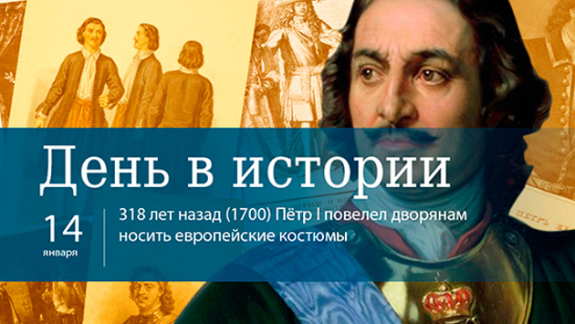 204 года назад (1814) в Санкт-Петербурге состоялось торжественное открытие Императорской Публичной библиотеки (ныне — Российская национальная библиотека). Она была основана в мае 1795 года указом императрицы Екатерины II и стала первой государственной библиотекой России. В её основу легла коллекция книг и рукописей братьев Залуских, привезенная из Варшавы. В 1810 году император Александр I принял закон об обязательном экземпляре, согласно которому библиотека стала получать по два бесплатных экземпляра всех российских печатных изданий. Место для библиотеки было выбрано в самом центре Петербурга, на углу Невского проспекта и Садовой улицы. Здание было построено по проекту архитектора Егор Соколова. 14 января 1814 года библиотека была торжественно открыта. Она была доступна для всех, «всякий читатель имел свободный вход в оную, какого бы звания или чина он не был». После Октябрьской революции Императорская Публичная библиотека была переименована в Российскую публичную библиотеку, затем ей было присвоено имя М. Е. Салтыкова-Щедрина. С 1937 года она стала называться Государственной публичной библиотекой им. М. Е. Салтыкова-Щедрина. В марте 1992 года указом Президента РФ библиотека была преобразована в Российскую национальную библиотеку (РНБ). В том же году её был присвоен статус особо ценного объекта национального наследия. Сегодня РНБ — пятая библиотека мира по объёму фондов. Здесь храниться около 38 миллионов экземпляров книг и других информационных ресурсов. Ежегодно библиотеку посещает более 1 миллиона читателей. 318 лет назад (1700) Пётр I повелел дворянам носить европейские костюмы. Именным указом «О ношении платья на манер Венгерского» он постановил всем знатным людям «на Москве и в городах, носить платья, венгерские кафтаны, верхние длиною по подвязку, а исподние короче верхних, тем же подобным». Мужской костюм, введённый реформами Петра I, состоял из кафтана, камзола и штанов. Кафтан был длиной до колен, узкий в талии и плотно облегавший фигуру в верхней части. Камзол был короче кафтана, без воротника и с длинным узким рукавом без обшлага. Дополняли костюм кружевное жабо и манжеты, кожаные башмаки с тупым носком, на каблуке, украшенные бантами или пряжками, и шёлковые чулки С 1 января 1701 года женщины должны были сменить тяжёлые сарафаны на европейское платье. Согласно новой моде они стали носить глубоко декольтированные французские платья, а также завивать волосы в локоны и пользоваться румянами и белилами. Новые порядки приживались с большим трудом. Переходу на европейское платье противились, с ослушников брали пошлину, а портных, шивших «старое» платье, наказывали. Всего в период своего правления Пётр I издал около 20 указов, которыми регламентировались внешний вид подданных и правила ношения различных видов одежды.