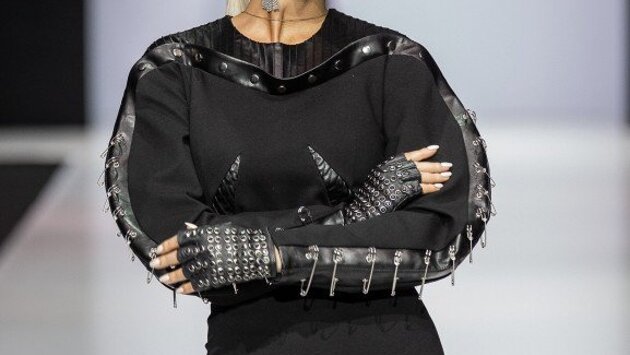 Мария Погребняк вышла на подиум в японском головном уборе, похожем на торшер